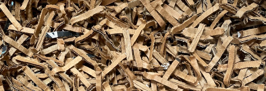 Shredded Cardboard is perfect for void fill padding for packages, pet bedding, fire starters, garden compost component. It's a good eco alternative to foam for packing peanuts when used for shipping.